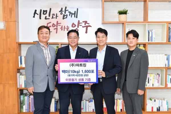 [금요저널] 양주시는 옥정동에 위치한 ㈜마트킹에서 저소득층을 돕기 위해 백미 1,600포를 기부했다고 27일 밝혔다.