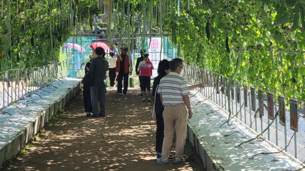 [금요저널] 나리농원을 찾은 관람객들이 어린이들이 그린 텃밭 그림을 보며 흐뭇한 미소와 관심으로 발길이 이어지고 있다.