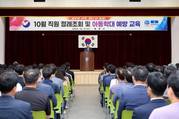 [금요저널] 통영시는 긴 추석연휴기간이 끝나고 새로운 일상이 시작된 지난 10월 4일 새롭게 리모델링한 시청 강당에서 전 직원이 참석한 가운데 직원 정례조회를 열고 그 동안의 시정 추진상황과 10월 주요일정 등을 공유하는 시간을 가졌다고 전했다.