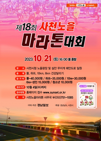 [금요저널] 전국 9대 노을을 배경으로 아름다운 바닷길을 질주하는 제18회 사천노을마라톤대회가 오는 10월 21일 무지개 해안도로 일원에서 열린다.