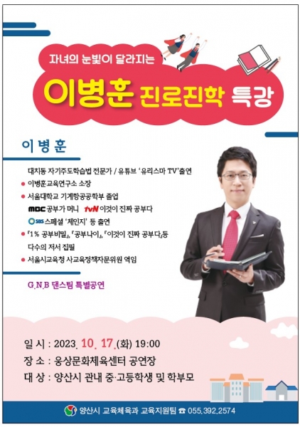 이번 특강은 10월 17일 오후 7시 웅상문화체육센터 공연장에서 진행하며 ‘자기주도학습을 위한 과목별 학습법’이라는 주제로 이병훈 교육연구소 소장을 강연자로 초청했다.