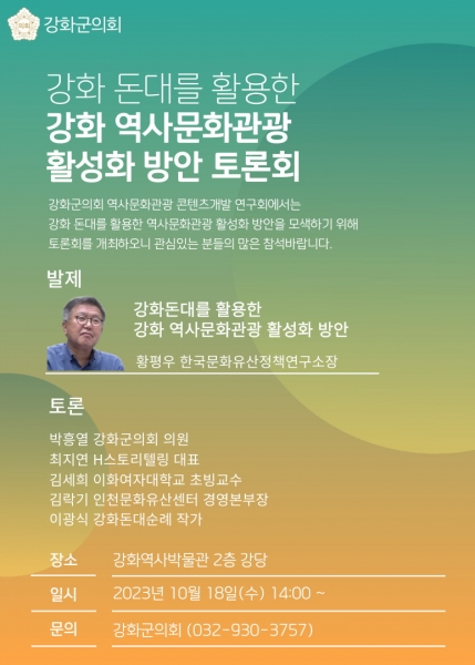 박흥열 강화군의회 의원이 좌장을 맡으며 최지연 H스토리텔링 대표, 김세희 이화여대 초빙교수, 김락기 인천문화유산센터 경영본부장, 이광식 강화돈대순례 작가가 토론자로 참석한다.