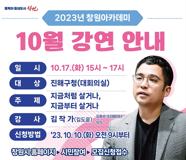 2023년 창원아카데미는 17일 오후 3시, 진해구청에서 열리는 ‘김작가TV’로 유명한 김작가 유튜브 크리에이터의 ‘지금처럼 살거나, 지금부터 살거나’ 초청 강연을 끝으로 막을 내린다.