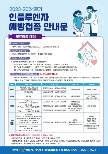 [금요저널] 양산시는 인플루엔자 유행에 대비해 13세 이하 어린이, 임신부, 65세 이상 어르신, 취약계층을 대상으로 인플루엔자 무료 접종을 실시한다.