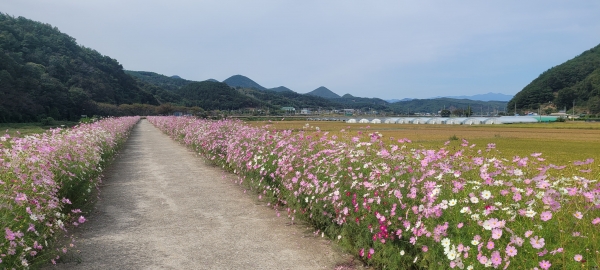 [금요저널] 사천시 곤양면 곤양천 둑방길을 따라 코스모스가 아름답게 수놓아 방문하는 이들의 마음을 설레게 하고 있다.