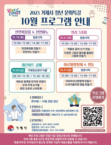 [금요저널] 거제시는 거제청년센터‘이룸’과 청춘다락에서 운영하는‘청년 문화특강 9월 프로그램’을 성황리에 마쳤다고 밝혔다.