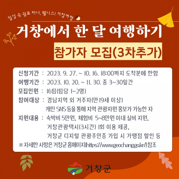[금요저널] 거창군은 오는 16일까지 ‘거창에서 한 달 여행하기’ 3차 참가자 16팀을 추가 모집한다.