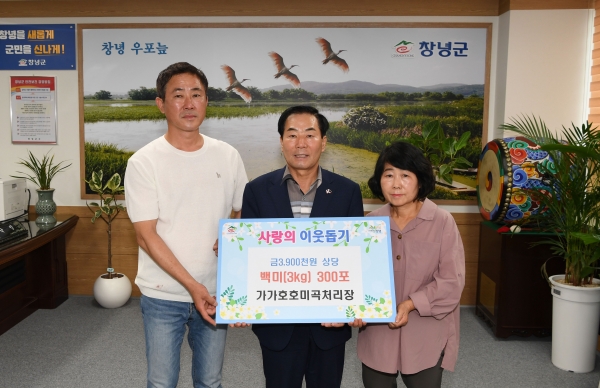 불우이웃을 위해 가가호호미곡처리장은 390만원 상당의 백미 3kg 300포, 청년 농업인 이정윤·김나은 부부는 어려운 이웃들을 위해 직접 농사를 지은 300만원 상당의 백미 10kg 100포를 창녕군에 기탁했다.