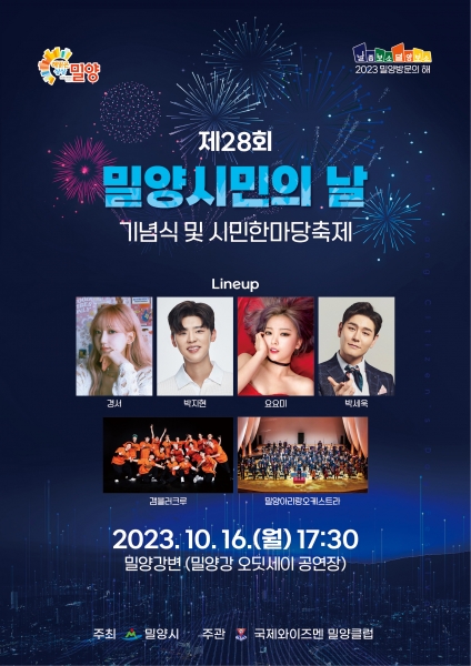 [금요저널] 밀양시는 오는 16일 오후 5시 30분부터 밀양강변 오딧세이 공연장에서 국제와이즈멘 밀양클럽 주관으로 제28회 밀양시민의 날 기념행사를 개최한다.