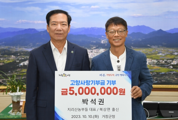 [금요저널] 거창군은 10일 군수실에서 박석권 지리산농부들 대표가 고향사랑기부제 기부 최고 금액인 500만원을 기부하고 답례품으로 제공받은 150만원의 거창사랑상품권을 고향인 북상면에 다시 기부했다고 밝혔다.