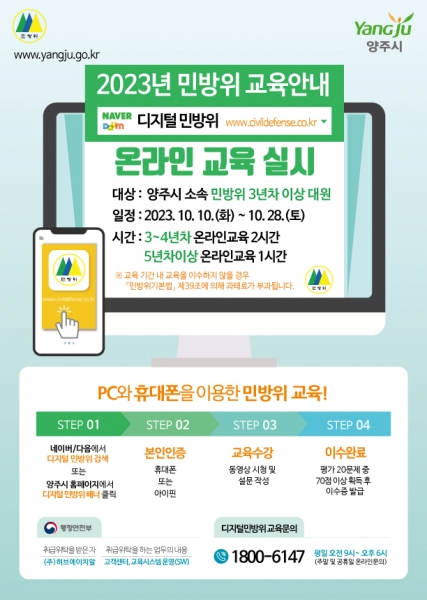 ‘민방위 사이버교육’은 PC, 스마트폰으로 양주시청 홈페이지 배너 또는 ‘디지털 민방위’ 홈페이지를 통해 접속해 수강할 수 있으며 최종 평가 70점 이상 점수를 취득하면 이수가 완료된다.