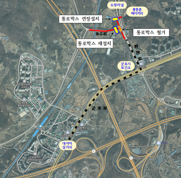 군포시, 도장터널~보건소사거리 간 우회전차로 확장 공사로 ‘차량통제’ .우회도로 이용 당부