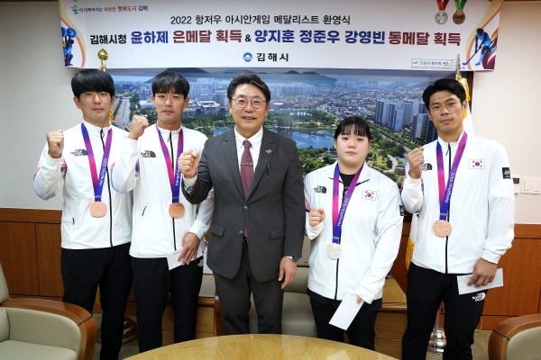 [금요저널] 김해시는 제19회 항저우 아시안게임에서 우수한 성적을 거둔 김해시청 소속 메달리스트들을 초청해 축하하고 포상금을 전달했다고 11일 밝혔다.