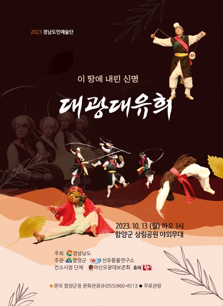[금요저널] 함양군은 오는 10월 13일 오후 1시 상림공원 야외무대에서 경남도민예술단의 ‘이 땅에 내린 신명 대광대 유희’ 공연을 개최한다고 밝혔다.