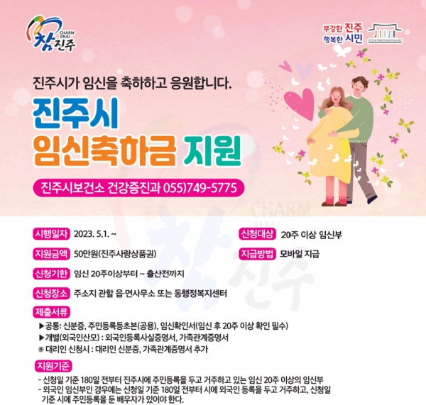 진주시의 임신축하금 지원사업은 임신을 축하하고 응원하며 임신에 소요되는 경제적 부담을 경감해 출산장려 분위기를 조성하기 위해 마련됐다.