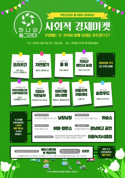 [금요저널] 하동군은 오는 14·15일 이틀간 롯데몰 진주점 1층 희망이룸길에서 ‘2023 하동군 사회적경제 한마당 행사’를 개최한다고 12일 밝혔다.