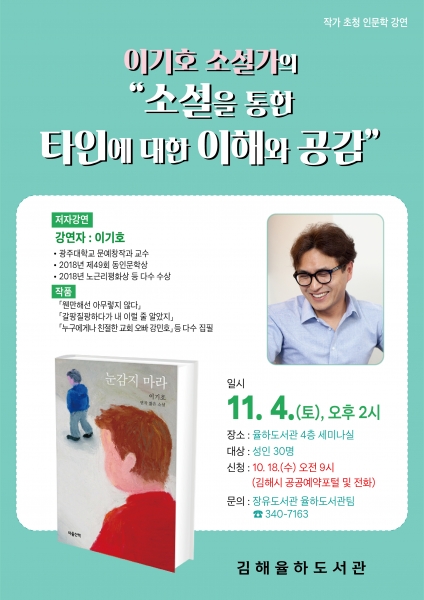 [금요저널] 김해율하도서관은 오는 11월 4일 오후2시 이기호 작가 강연, 11월 18일 오후 2시 최진영 작가 강연을 개최한다고 밝혔다.