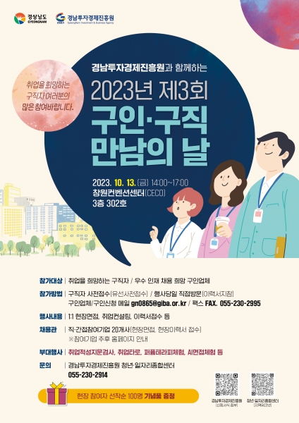 [금요저널] 경남투자경제진흥원은 13일 오후 2시부터 5시까지 창원 컨벤션센터 3층에서 ‘2023년 3회 구인·구직 만남의 날 채용행사'를 개최한다.