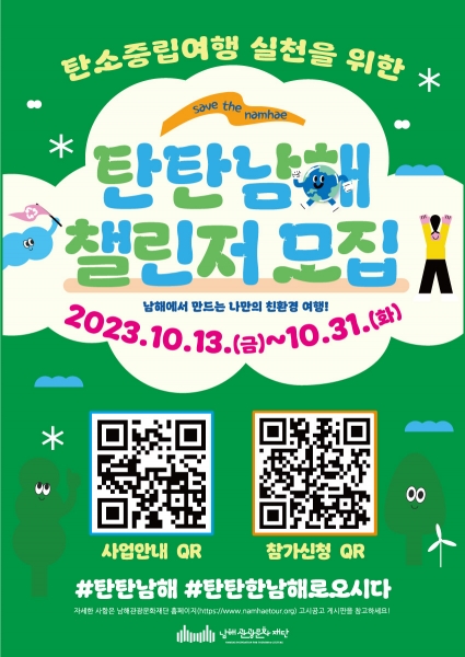 [금요저널] 남해관광문화재단은 오는 10월 13일부터 10월 31일까지 친환경 여행을 실천할 ‘탄탄남해 챌린저’를 네이버폼을 통해 추가 모집한다고 밝혔다.
