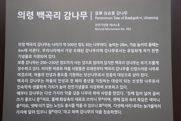 이 감나무는 수령 500년 된 감나무로 높이 28m, 가슴높이 둘레가 4m에 이르는 우리나라에서 가장 오래된 감나무다.