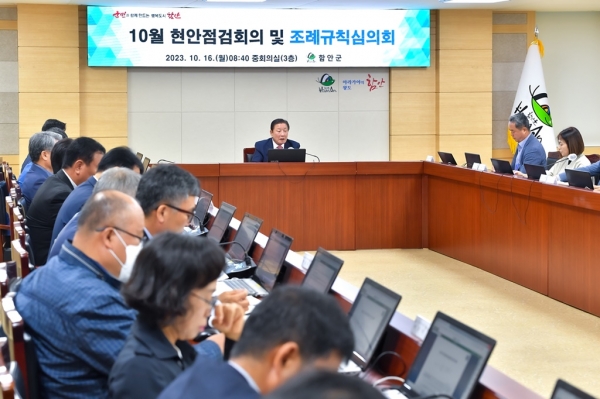 [금요저널] 함안군은 16일 오전 군청 별관 3층 중회의실에서 조근제 함안군수 주재로 10월 현안점검회의를 개최했다.
