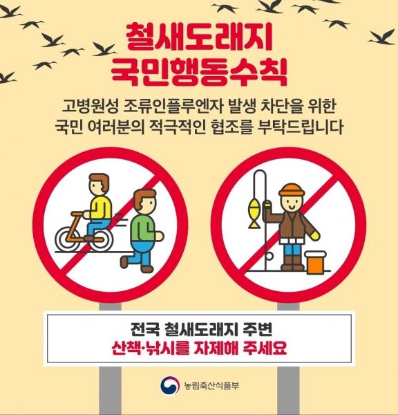 시 관계자는 “특히 전국 철새도래지 주변 산책·낚시를 자제해 달라”며 “사육 가금에서 폐사 증가, 산란율 저하 등 고병원성 AI 의심 증상이 관찰되면 즉시 방역당국에 신고해 줄 것”을 당부했다.