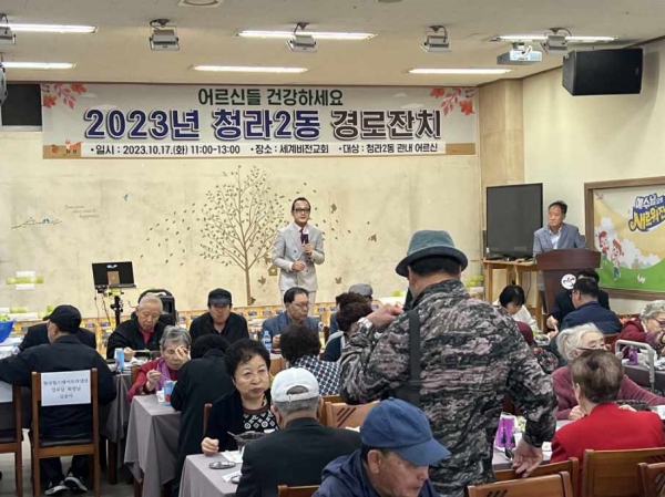 [금요저널] 인천 서구 청라2동 행정복지센터는 지난 17일 노인의 날을 기념해 관내 세계비전교회 식당에서 관내 어르신 400여명을 모시고 경로잔치를 개최했다고 밝혔다.