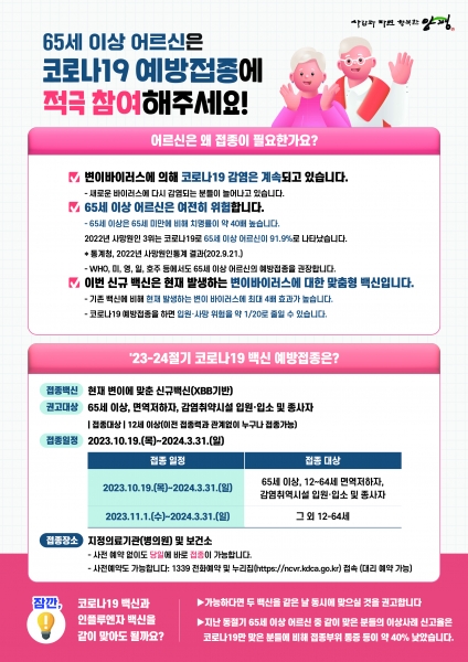 코로나19는 지난 8월 더 이상의 신고와 감시가 필요 없는 4급 감염병으로 전환됐으나 신규바이러스의 지속적인 출현, 백신 접종 시간 경과와 감염으로 획득한 면역력 감소로 인해 주기적 예방접종이 필요하다.
