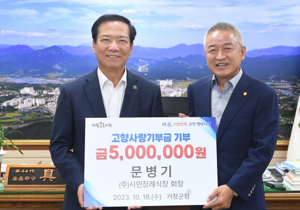 [금요저널] 거창군은 지난 18일 군수실에서 문병기 ㈜시민장례식장 회장이 고향사랑기부제 최고 금액인 500만원을 군에 기부했다고 밝혔다.