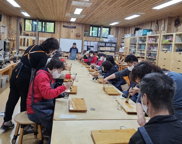 또한, 나무 향기를 맡으며 목공체험으로 나무 도마를 만들고 물맑음 휴 힐링여행 활동을 통해 지친 몸과 마음의 활력을 찾는 시간을 가졌다.
