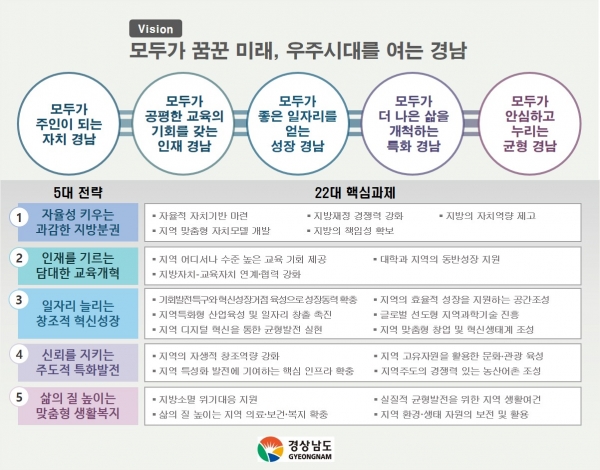 경상남도 지방시대계획은 지난 7월 10일 자치분권과 균형발전을 통합하는‘지방자치분권 및 지역균형에 관한 특별법’제정 및 시행에 따라 5대 전략 22대 핵심과제 68개 실천과제별로 수립했다.
