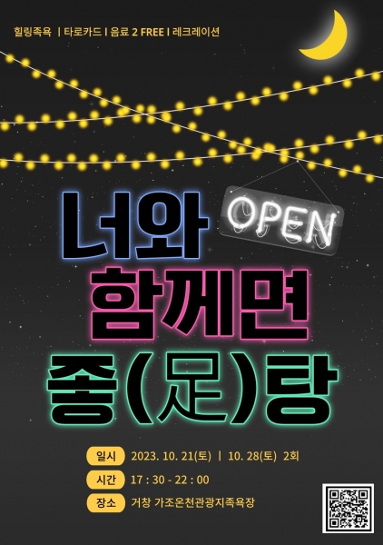 가조온천 족욕장에서는 21일과 28일 2회에 걸쳐 가족, 연인들과 함께 족욕을 하면서 먹고 즐길 수 있는 ‘너랑 함께면 좋탕’이라는 이색적인 행사가 열린다.