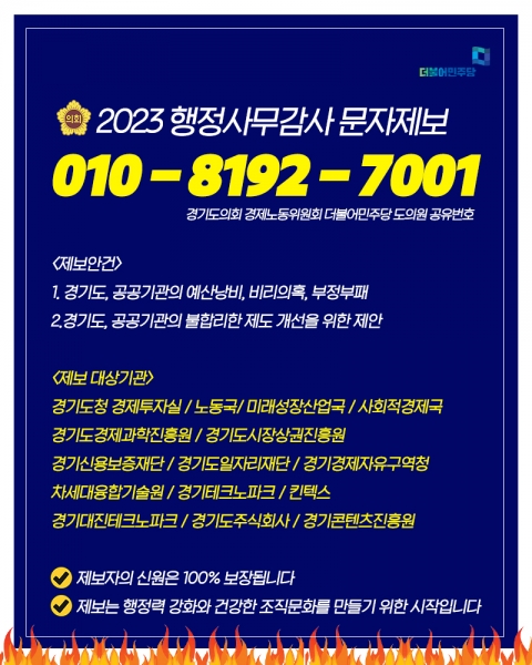 경기도의회 경제노동위원회 더불어민주당 의원 일동은 문자메시지 제보로 경기도 집행부와 공공기관의 행정 및 경제 분야 관련 문제와 공직자 비리, 정책개선 과제와 예산 낭비 등의 사례를 접수할 예정이다.