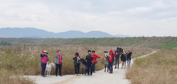 말에게 당근을 주고 쓰다듬기도 하며 사람과 말이 서로 교감하고 친해지는 시간을 가진 뒤, 약 1㎞의 악양둑방을 함께 걸으면서 주위 풍경을 즐기는 힐링의 시간을 가졌다.