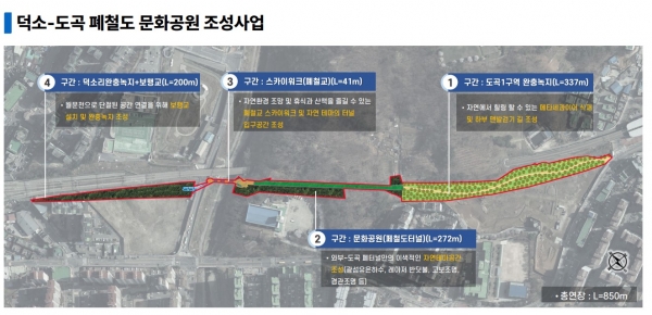 폐철도를 포함한 문화공원의 면적은 3,954㎡이며 덕소리와 도곡리를 연결하는 사업 구간의 총연장은 850m로 계획하고 있다.