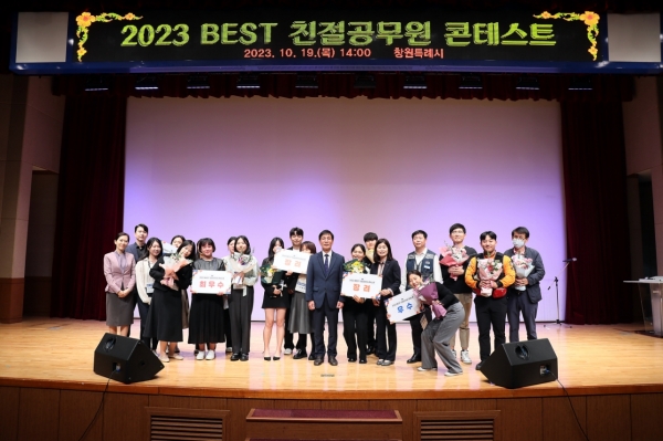 이날 ‘금쪽같은 내 민원인’이라는 주제로 발표한 마산회원구 민원지적과 문수진, 조은수, 이햇살, 이은진 주무관이 최우수상을 수상해 2023년 ‘Best 친절공무원’의 영예를 차지했고 우수 2팀 장려 3팀이 각각 수상의 영예를 안았다.