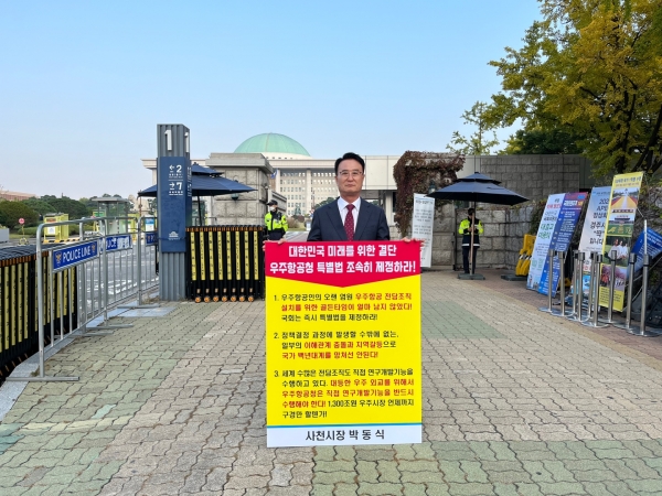 이에 박 시장은 ‘대한민국 미래를 위한 결단, 우주항공청 특별법 조속히 제정하라’는 문구가 적힌 피켓을 들고 1인시위에 나서는 등 우주항공청 특별법 통과를 촉구했다.