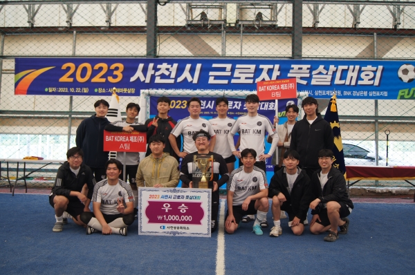 사천시 관내 9개 회사 12개 직장동호회가 참가한 이번 대회에서는 BAT KOREA제조 A팀이 우승 트로피를 들어올리는 영예를 안았다.