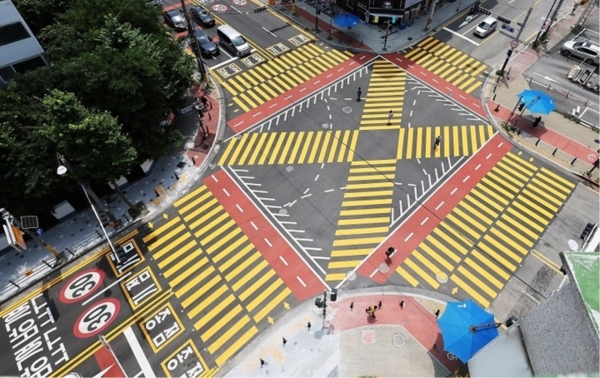 ‘노란색 횡단보도’는 운전자의 시인성을 높여 어린이보호구역 내 교통사고를 예방하기 위해 도입된 것으로 횡단보도 색깔만으로 자신이 지나는 도로가 어린이보호구역이라는 점을 명확하게 인식하게 해 어린이 교통사고 예방에 효과적이다.