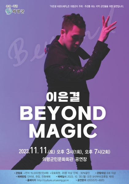 [금요저널] 의령군은 세계적인 마술사 이은결의 ‘BEYOND MAGIC’ 기획공연을 의령군민문화회관 공연장 11월 11일 오후 3시와 7시에 진행한다고 밝혔다.