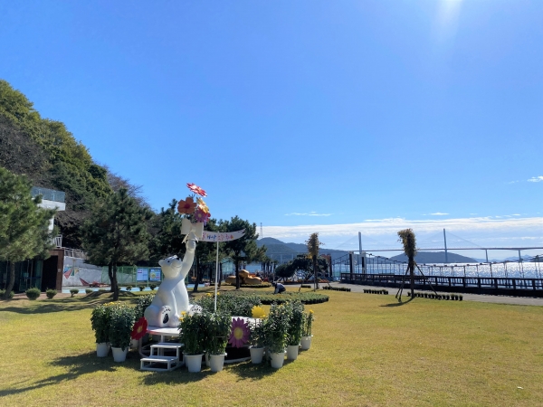 꽃밭 뒤로는 마산만의 푸른 절경이 파노라마처럼 펼쳐져 가슴을 뻥 뚫는다.
