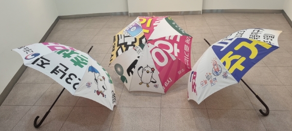 ‘폐현수막 새활용 우산’은 지난해 행정안전부 폐현수막 재활용 공모사업에 선정돼 일회성으로 소모되는 폐현수막 처리방안의 일환으로 우산을 제작, 무료 대여서비스를 실시했는데 시민들의 큰 호응으로 올해는 파라솔도 함께 제작하게 됐다.
