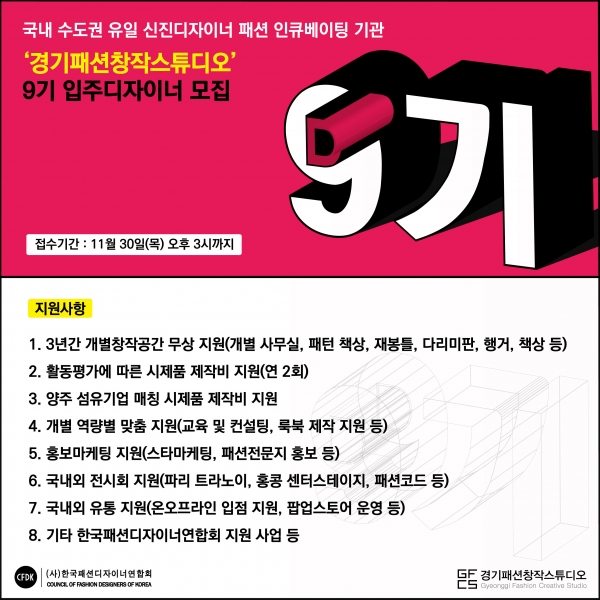 선정된 디자이너는 내년 1월 1일부터 최대 36개월까지 스튜디오 입주 자격이 주어지며 디자인 작업을 할 수 있는 개별창작공간을 비롯해 특수봉제실, 포토스튜디오, 리소스실 등 공동시설을 제공받고 시제품 제작, 마케팅, 교육 및 컨설팅 등을 무상으로 지원받게 된다.