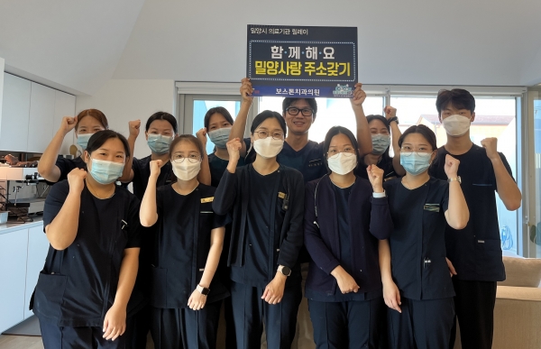 최정훈 보스턴치과의원 원장은 밀양시의 인구감소가 의료기관뿐만 아니라 시 전체 경제에 미치는 영향이 클 것이라며 ‘밀양 주소갖기 운동’ 릴레이 챌린지의 첫 시작을 알리고 직원들과 함께 적극 동참하기로 했다.