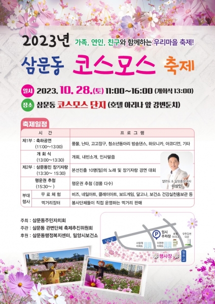 [금요저널] 밀양시 삼문동주민자치회는 오는 28일 삼문동 코스모스 단지에서 ‘2023년 삼문동 코스모스 축제’를 개최한다.