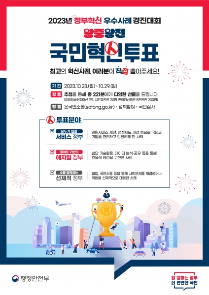 이번 경진대회는 전 행정기관과 공공기관에서 제출한 사례 중 1차 전문가 심사와 2차 온라인 국민심사를 거쳐 최종 시상 대상이 결정된다.