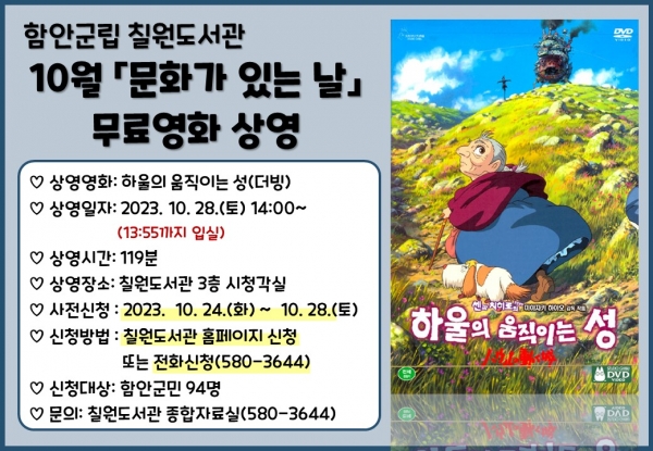 [금요저널] 함안군립 칠원도서관은 오는 28일 토요일 오후 2시, 3층 시청각실에서 애니메이션 영화 ‘하울의 움직이는 성’을 무료로 상영한다.