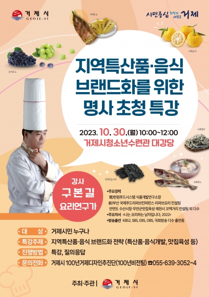 [금요저널] 거제시는 지역특산품 및 음식 브랜드화 전략이라는 주제로 오는 30일 오전 10시부터 거제시청소년수련관 대공연장에서 구본길 요리연구가 초청 특강을 개최한다.