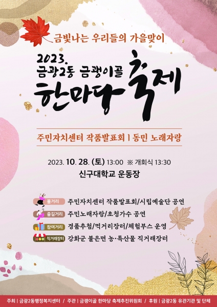 [금요저널] 성남시는 ‘2023. 금괭이골 한마당 축제’가 오는 10월 28일 오후 1시~오후 5시 30분 신구대학교 운동장에서 열린다고 26일 밝혔다.
