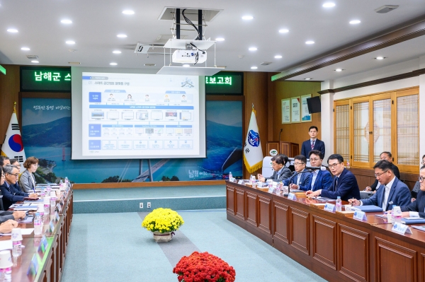 [금요저널] 남해군은 25일 오전 군청회의실에서 장충남 군수를 비롯한 관계자 30명이 참석한 가운데 ‘스마트 공간정보 플랫폼 구축 용역 완료보고회’를 개최했다.